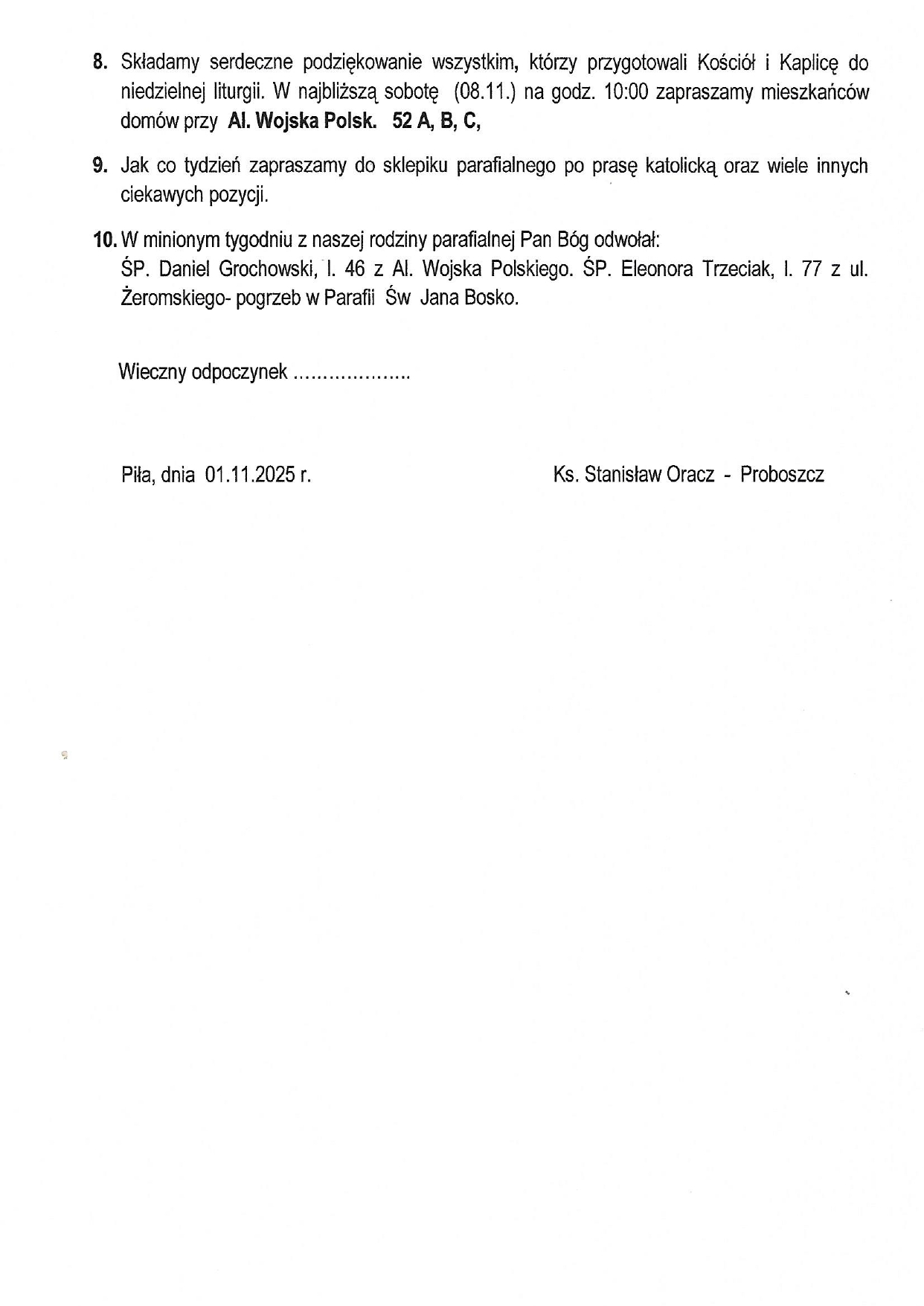 W pilnych sprawach (pogrzeb, wezwanie do chorego) prosimy kontaktować się z ks. dyżurnym lub innym księdzem o dowolnej porze.